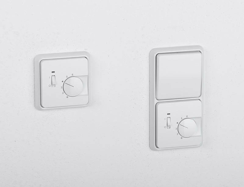 Beschreibung: RTR-5523 (rg) Raumtemperaturregler u.P., 230 V AC, einschl. Zentralscheibe, ohne Abdeckrahmen, Farbe: reinweiß glänzend, ähnlich RAL9010, Ausführung für Heiz- oder Kühlbetrieb über Ein-Rohr-System zur Ansteuerung von Stellantrieb stromlos geschlossen, mit Umschalter "Heiz- oder Kühlbetrieb", Wechslerkontakt 5(2)A, Einstellbereich 5-30°C mit Bereichseinengung, Berührungsschutzkappe